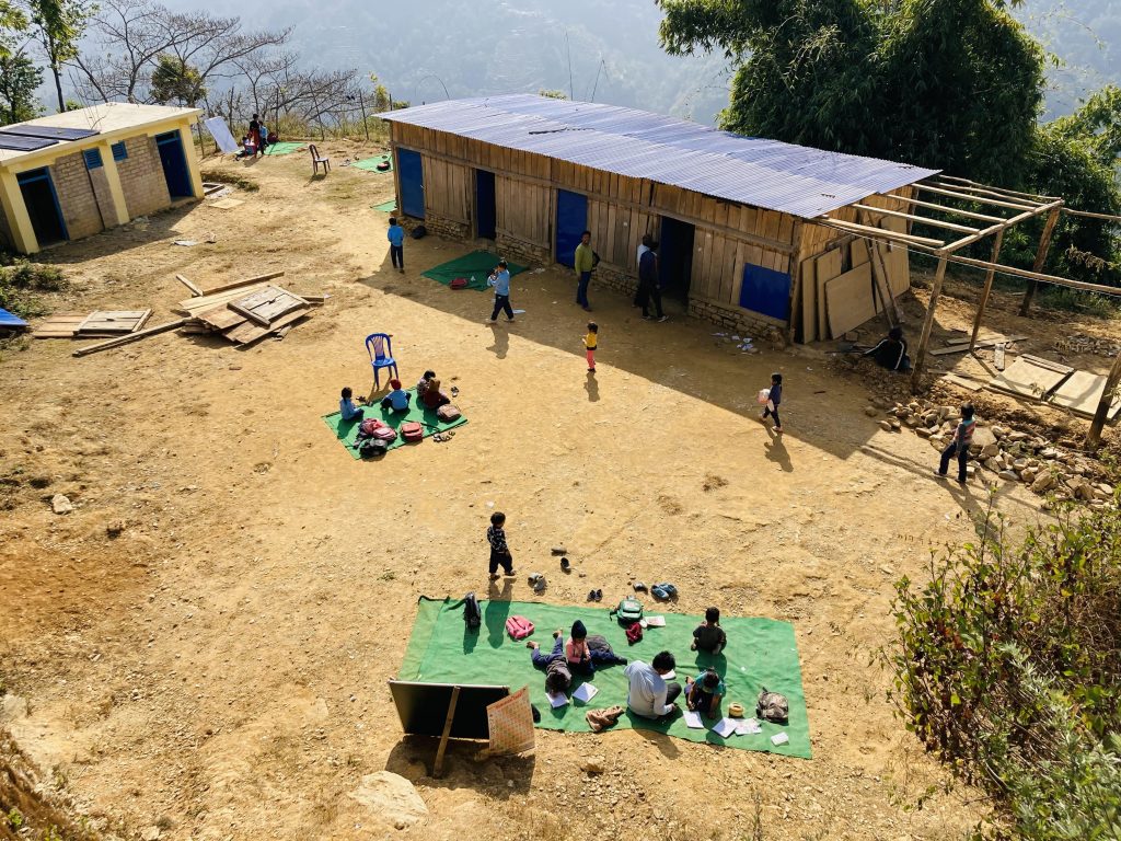 भिरालो जमिन खारेर बनाइएको चौरको छेउमा काठले बारेको तीन कोठ अस्थायी टहरा । टहराको एउटा कोठामा कार्यालय र अर्का दुई कोठामा पठनपाठन । अन्य तीन कक्षा खुला आकाशमुनि । विद्यालयको प्राङ्गणमा कार्पेटमाथि चलिरहेको पठनपाठनको दृश्य बागलुङको जैमिनी नगरपालिकाभित्रको हो ।