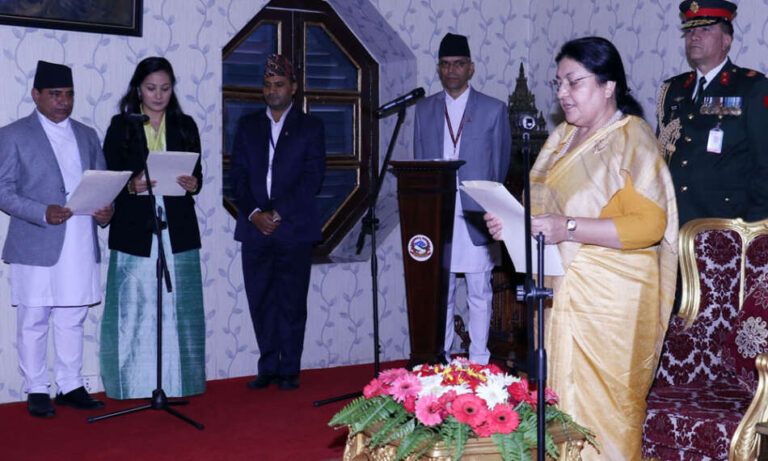 राष्ट्रपति विद्यादेवी भण्डारीसमक्ष नवनिर्वाचित सभामुख देवराज घिमिरेले पद तथा गोपनीयताको शपथ लिनुभएको छ । राष्ट्रपति कार्यालय शीतल निवासमा आज आयोजित समारोहमा राष्ट्रपति भण्डारीले सभामुख घिमिरेलाई शपथ गराउनुभयो ।