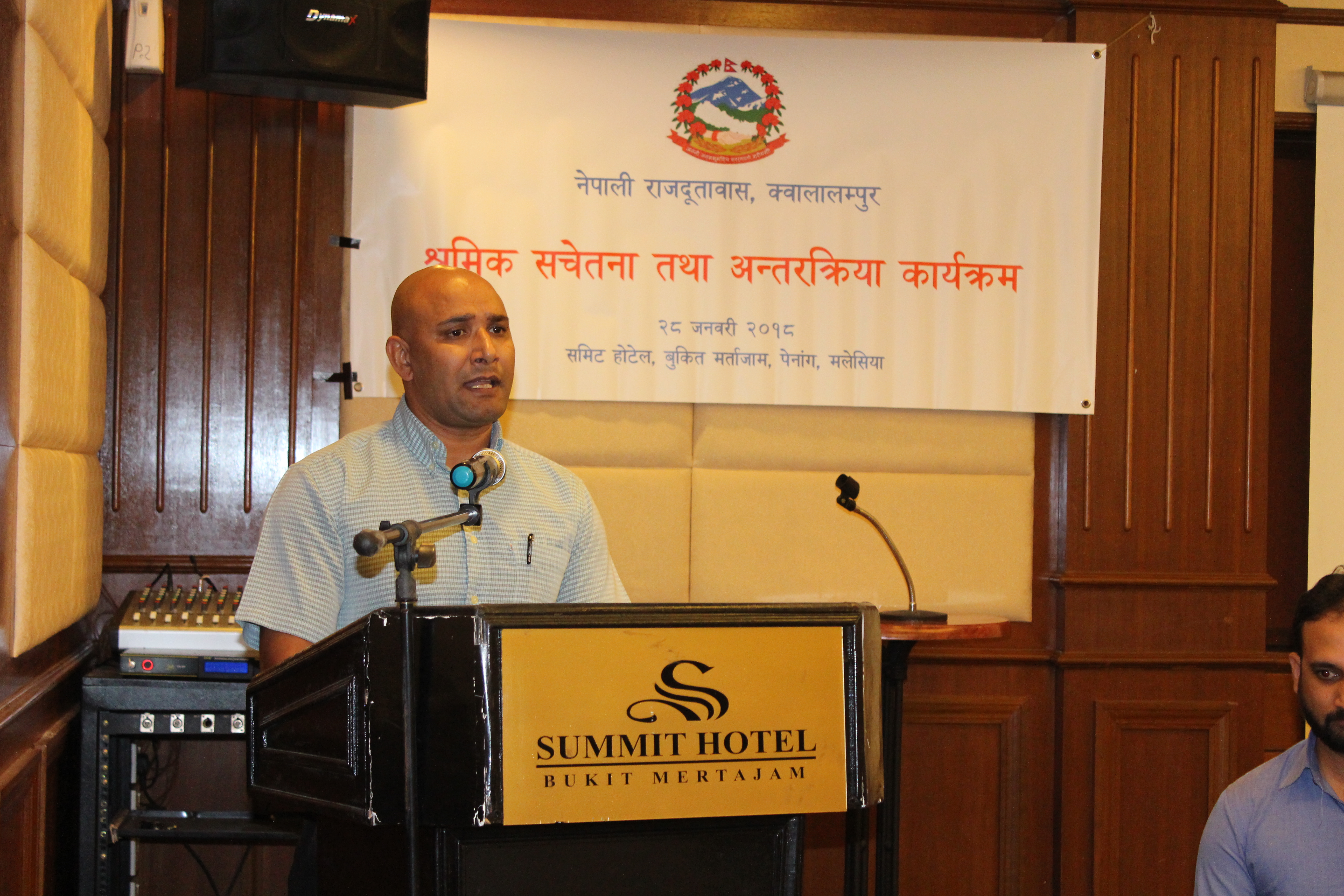 जन उद्दार केन्द्र, पेनाङ्गको समन्वयमा आयोजना गरिएको कार्यक्रममा राजदुतावासका श्रम काउन्सेलर बद्रिकुमार कार्कीले बैदेशिक रोजगारसँग सम्बन्धित निकायबाट पाउने सेवा सुबिधाका विषयमा जानकारी गराएका थिए ।