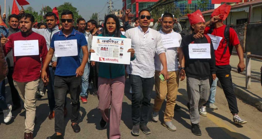 नक्कली भुटानी शरणार्थी प्रकरणका मूल दोषीलाई कानुन बमोजिम कारबाहीको माग गर्दै सिंहदरबारको दक्षिण मूल ढोकाअघि प्रदर्शन गरिएको छ ।