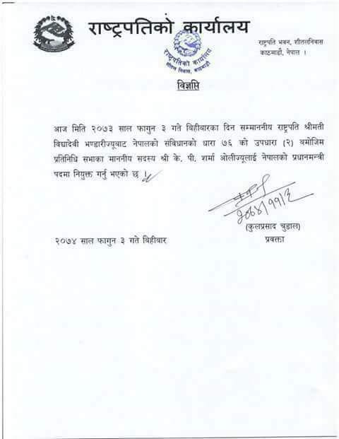 राष्ट्रपति कार्यालयका प्रवक्ता कुलप्रसाद चुडालद्वारा जारी विज्ञप्तिमा उल्लेख छ, ‘आज मिति २०७४ साल फागुन ३ गते बिहीबारका दिन सम्मानीय राष्ट्रपति श्रीमती विद्यादेवी भण्डारीज्युबाट नेपालको संविधानको धारा ७६ को उपधारा २ बमोजिम प्रतिनिधिसभाका माननीय सदस्य श्री केपी शर्मा ओलाीलाई नेपालको प्रधानमन्त्री पदमा नियुक्त गर्नुभएको छ।’