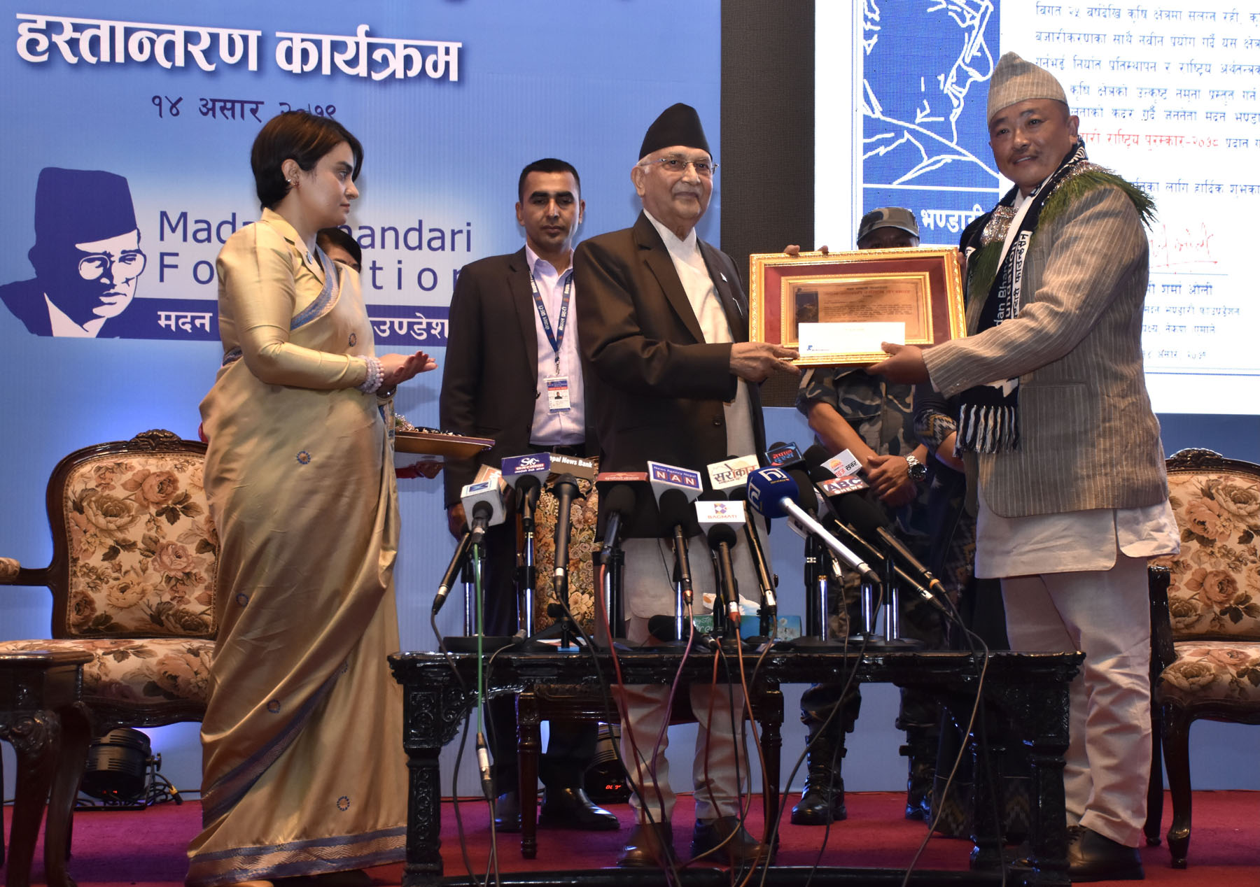 मदन भण्डारी फाउन्डेसनद्वारा मङ्गलबार राजधानीमा आयोजित जननेता मदन भण्डारीको ७१ओैँ जन्मजयन्ती समारोह मदन भण्डारी राष्ट्रिय पुरस्कार हस्तान्तरण कार्यक्रममा नेकपा (एमाले)का अध्यक्ष केपी शर्मा ओलीबाट भण्डरी राष्ट्रिय पुरस्कार ग्रहण गर्दै कृष्ण राई ।