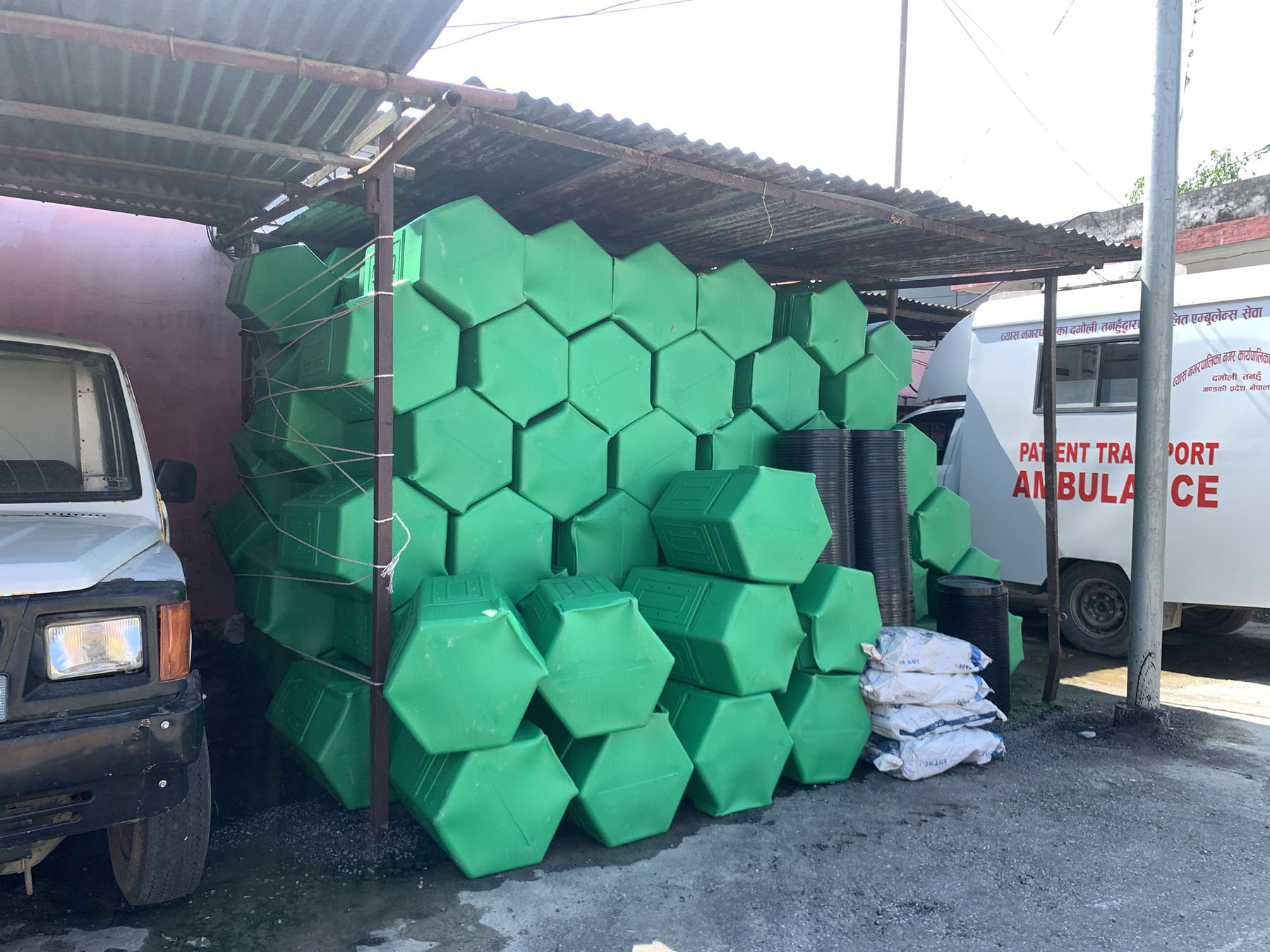 तनहुँको व्यास नगरपालिकामा वितरणका लागि राखिएको कम्पोष्ट विन । कुहिने फोहरमैला व्यवस्थापन गर्दै मल बनाउन र कौसीखेती प्रवद्र्धनका लागि सर्वसाधारणलाई कम्पोष्ट विन वितरणको तयारी गरिएको छ ।
