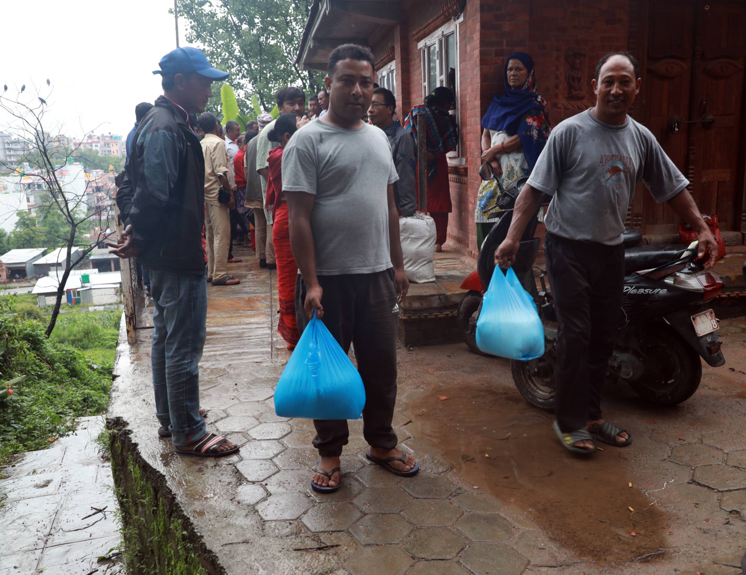 भक्तपुरको मध्यपुर थिमि–४, इन्द्रायणीमा आज बिहान वितरण गरेको युरिया मल लिएर घरतर्फ जाँदै किसान । कुपनको आधारमा प्रतिकुपन आठ केजीका दरले २०० जनालाई मात्र वितरण गरिएको छ । मल प्रतिकेजी रू २५ मा बिक्री गरिएको हो । RSS