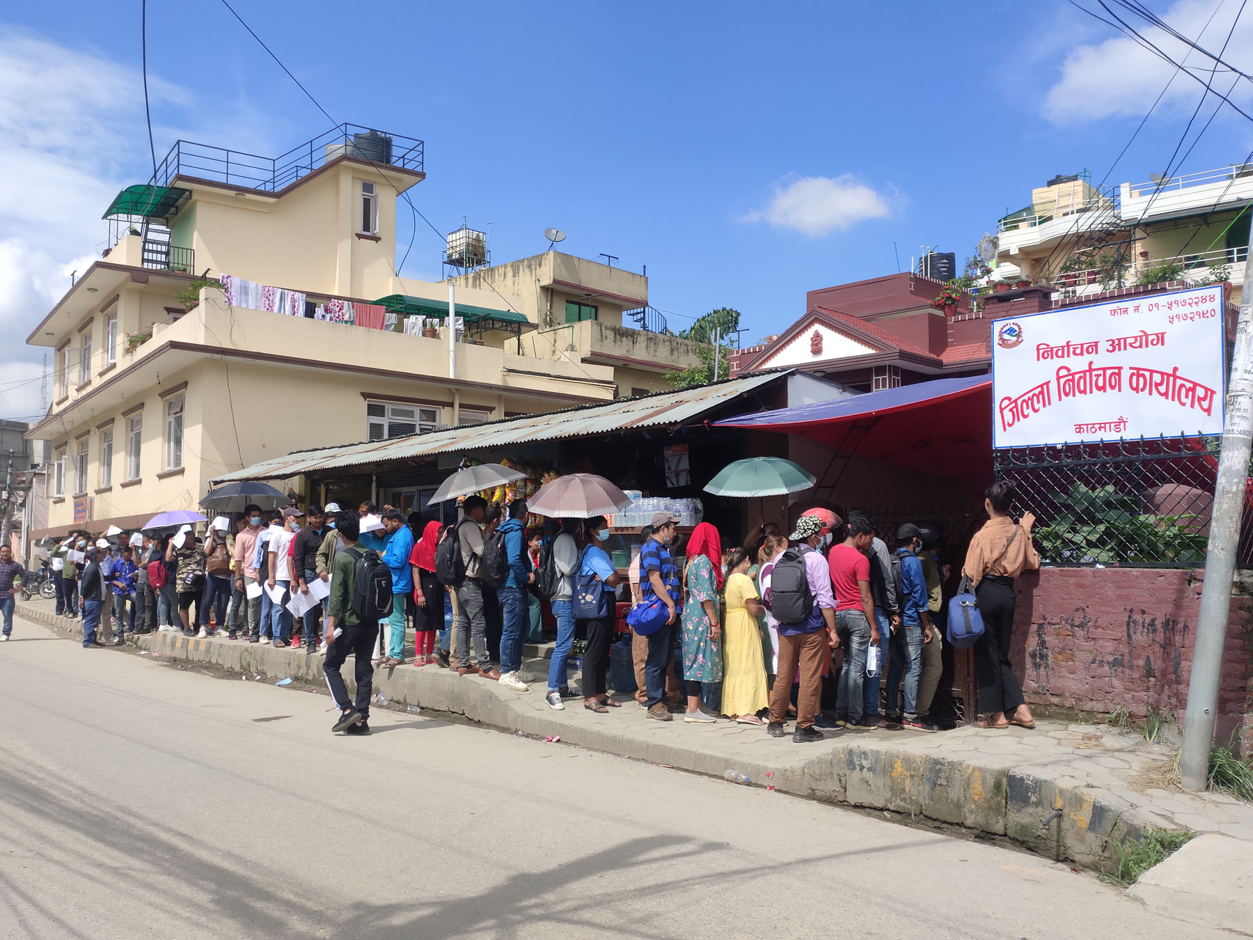 जिल्ला निर्वाचन कार्यालय काठमाडौँमा मतदाता परिचय पत्र बनाउन लामवद्ध सर्वसाधारण । निर्वाचन आयोगले तस्वीर सहितको मतदाता नामावली दर्ता सुरु गरेसँगै दर्ता गर्न आउनेको घुँईचो बढेको छ । ।
