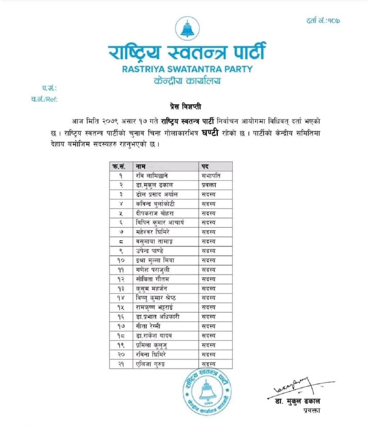 राष्ट्रिय स्वतन्त्र पार्टीले जारी गरेको विज्ञप्तिअनुसार रवि लामिछाने पार्टीका सभापति छन् डा. मुकुल ढकाल प्रवक्ता छन्।