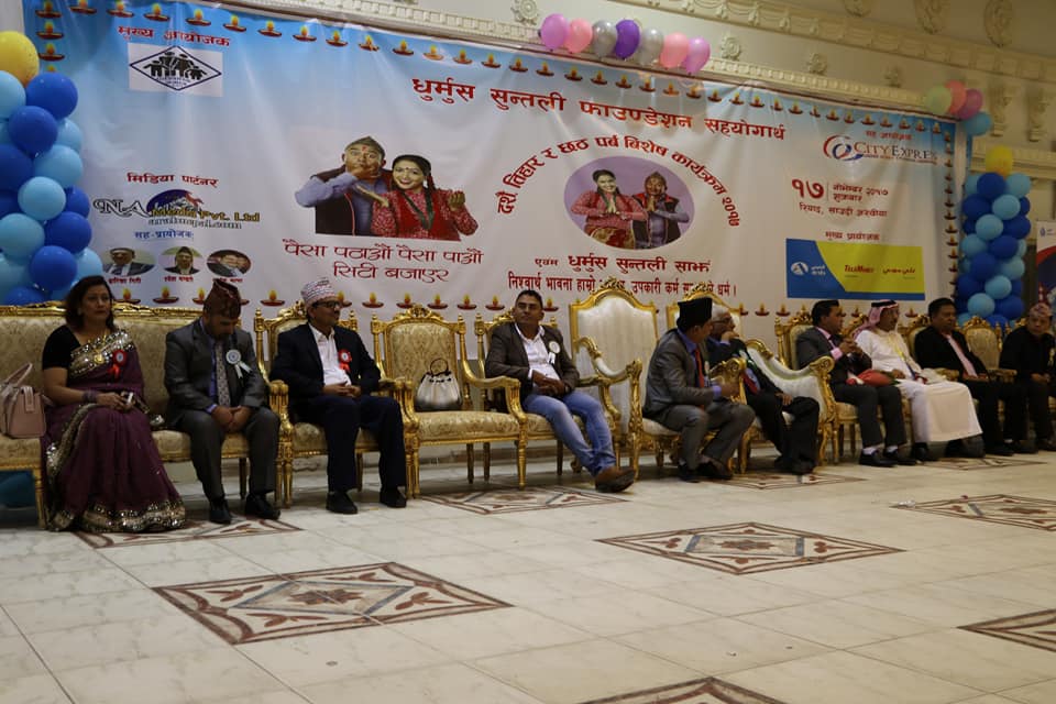समाजले साउदी अरबियामा रहेका नेपालीलाई मनोरञ्जन प्रदान गर्ने उदेस्यले मंशिर २ गते “धुर्मुस-सुन्तली साँझ” कार्यक्रम आयोजना गरेको थियो । कार्यक्रममा भाग लिन “धुर्मुस- सुन्तली” साउदी अरेबिया पुगेका थिए ।