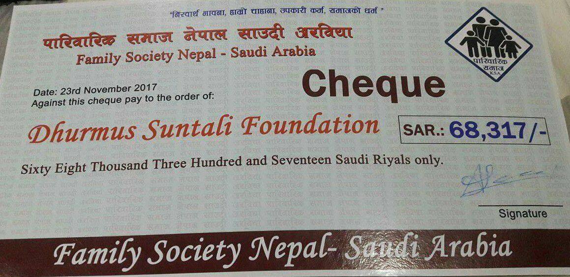 पारिवारिक समाज साउदी अरेवियाले गत साता फाउण्डेसनलाई सहयोग गर्ने उदेस्यले आयोजना गरेको कार्यक्रम लगायत बाट संकलित रकम सहयोग गरेका हुन् ।