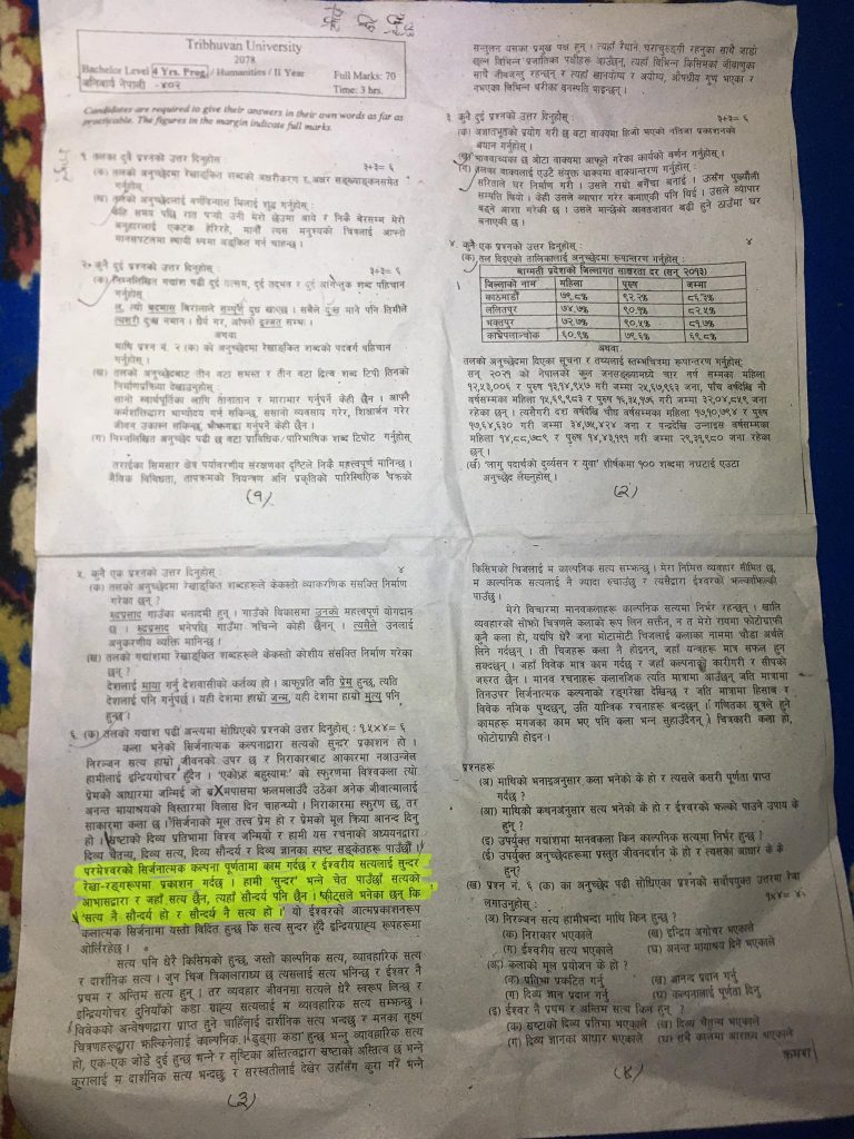 साथै प्रश्नपत्रको एक नम्बरमा नै तलका दुबै प्रश्नको उत्तर दिनुहोस् भनिएको छ । प्रश्नपत्रको (क) मा तलको अनुच्छेदमा रेखाङ्कित शब्दको अक्षरीकरण र अक्षर संख्याङ्कन समेत गर्नुहोस् भानियता पनि अनुच्छेद नै छैन जसले गर्दा विद्यार्थीले अनिवार्य भनिएको प्रश्न छोड्न बाध्य भएका छन् । यसले त्रिविको गम्भीर गम्भीर त्रुटी लाई देखाउन्छ ।