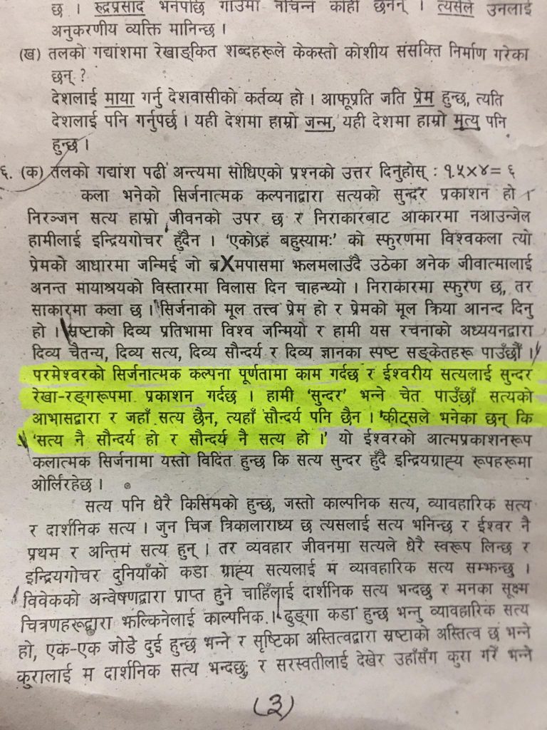 भनिन्छ शिक्षामा न कुनै धर्म न कुनै भेदभाव हुन्छ तर आज स्नातक तह दोस्रो बर्षको नेपाली विषयको परीक्षामा प्रश्नपत्रको ६ (क) मा तलको गद्यांश पढी अन्त्यमा सोधिएको प्रश्नको उत्तर दिनुहोस् ? भनेर सोधिएको थियो गद्यांशमा ईसाई धर्मलाई प्रचार गरेको जस्तो देखिन्छ ।
