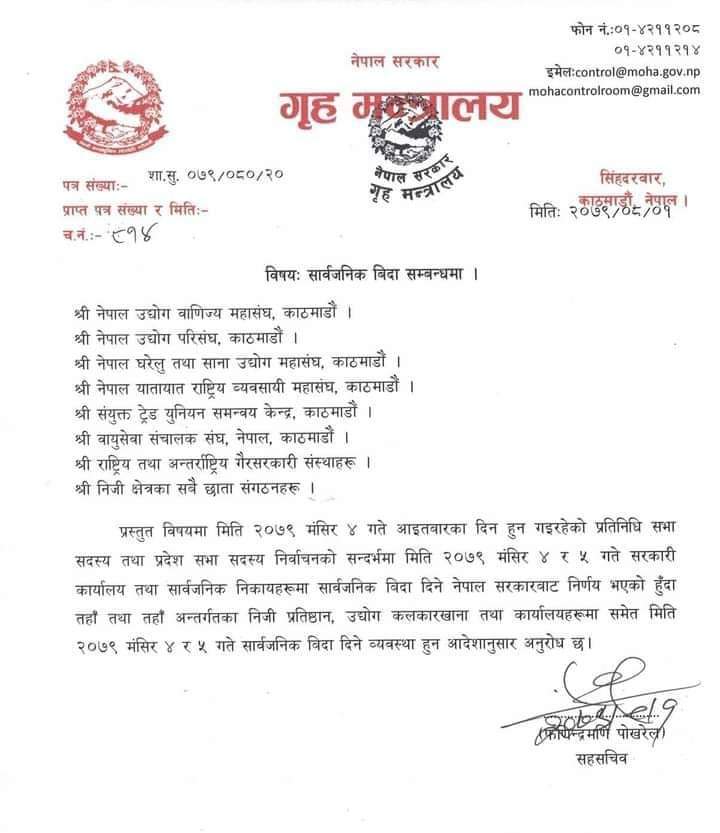 गृह मन्त्रालयले एक विज्ञप्ति जारी गर्दै मंसिर ४ र ५ गते सरकारी कार्यालय तथा सार्वजनिक निकायहरूमा सार्वजनिक बिदा दिने निर्णय भएकोले निजी क्षेत्रले पनि सो दिन सार्वजनिक बिदा दिएर निर्वाचन प्रक्रियामा सघाउन अनुरोघ गरिएको छ ।